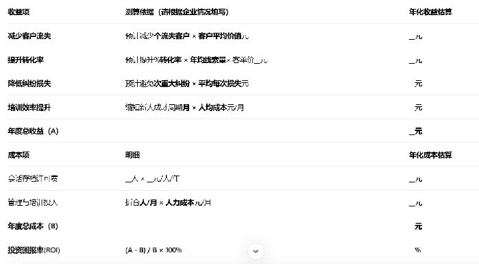运营管理成本:设置专人(可兼职)进行客户标签体系维护、SOP制定、会话质检与数据分析的持续投入。